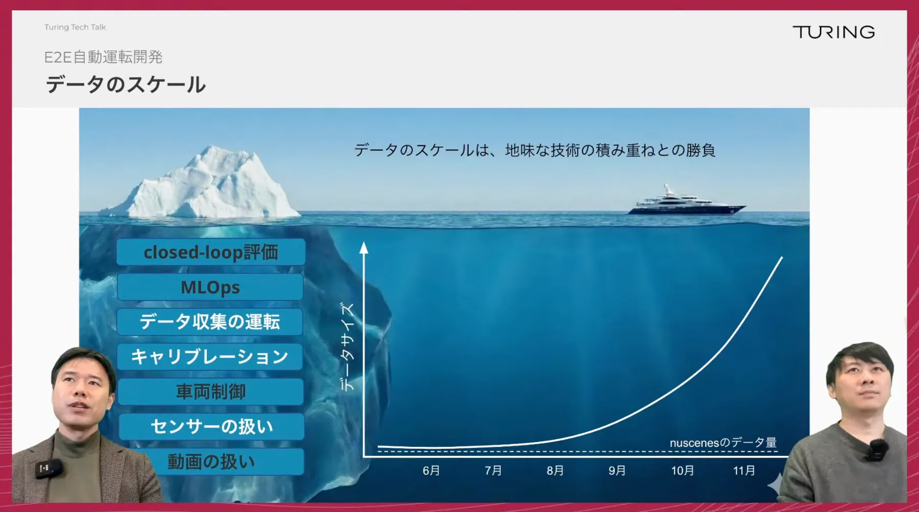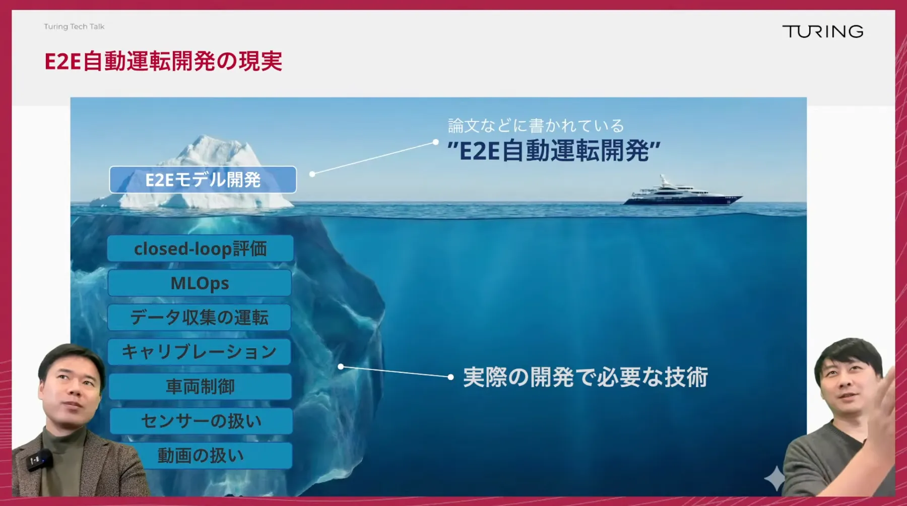 山口: ここからが今日の肝です。AI DAYでも「氷山」のスライドを出しましたが、E2Eって「モデル作れば走る」と思われやすい。でも現実は逆で、モデルは氷山の上に見えてる部分で、下が圧倒的に大きい。