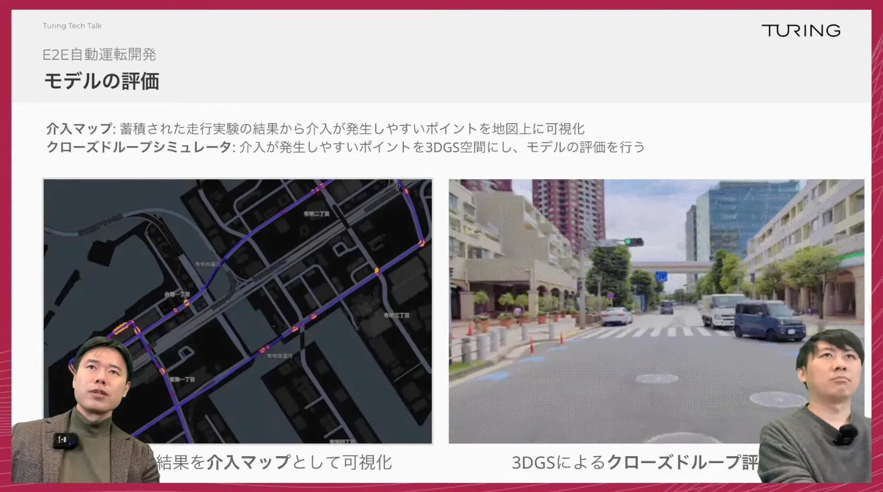 棚橋: もう1つ大きいのが評価です。公道走行で評価すると、同じシナリオが再現できない。時間帯で交通状況も変わるし、同じ交差点でも歩行者の出方が違う。モデルAとモデルBの差を見たいのに条件が揃わないので、「どっちが良いのか」を定量で判断しにくい。シミュレーターやクローズドループ評価についても、現実と同じ再現性を持って行うことはかなり難しいです。