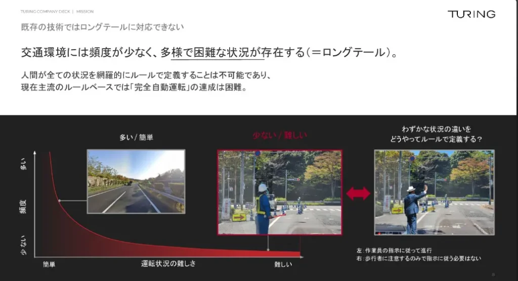 岩政さん:従来の自動運転システムは、物体の認識、予測、プラニングを各モジュールごとに開発を行っており、ルールベースでの設計が行われていました。ただ、実際の運転には頻度は少ないものの難易度が高い状況、いわば「ロングテール」の問題があります。