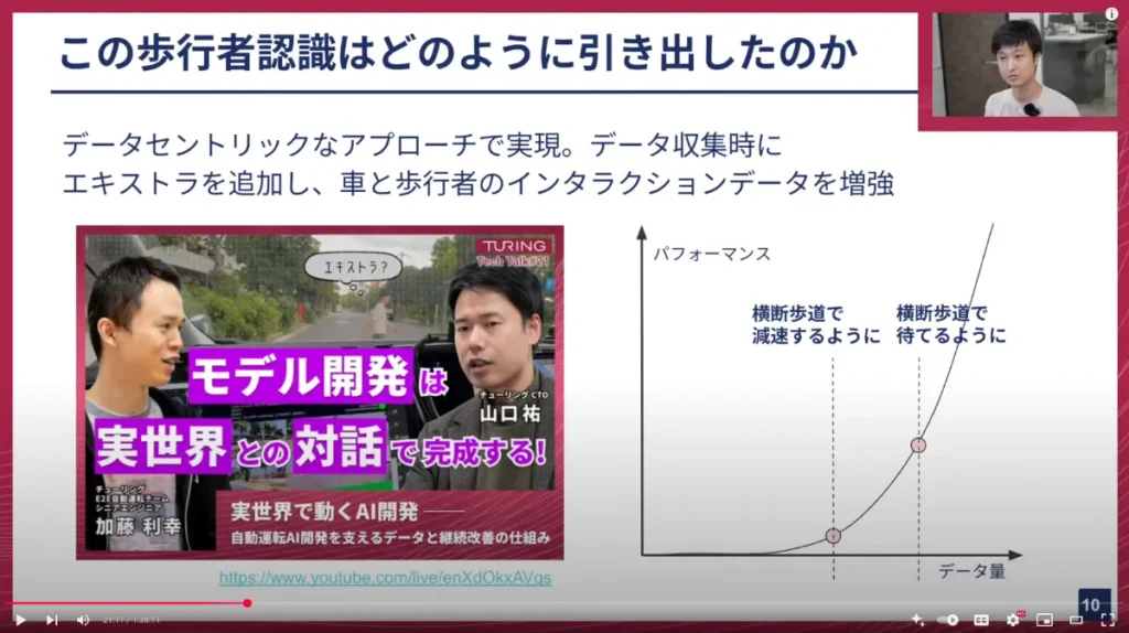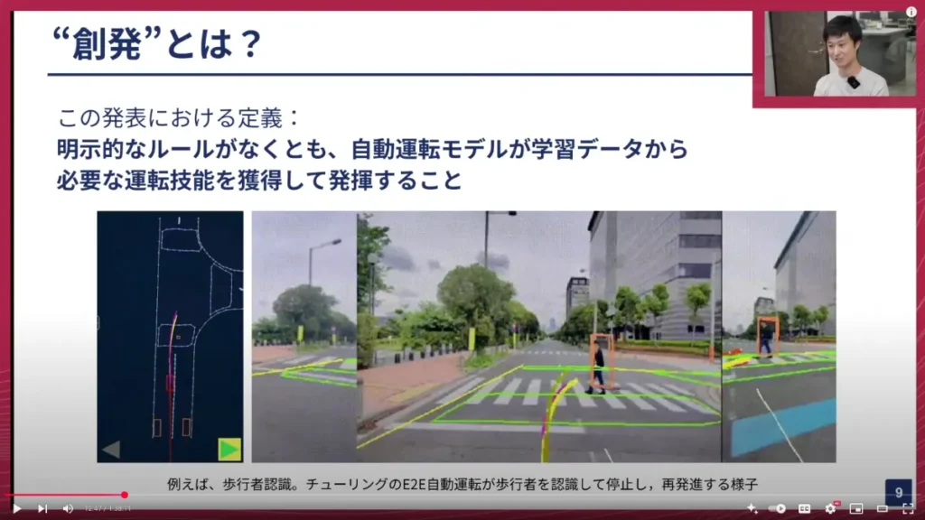 山口:なるほど。例えば、前回加藤さんが話してくれた「歩行者を待つ」という挙動もそうですね。これは人間にとっては当たり前のことですが、自動運転モデルにとっては非常に難しいことです。2ヶ月前くらいだと、まだ歩行者を待てない状態だったのが、あるところから急にできるようになったと。