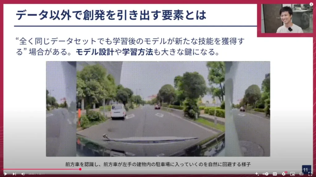 合田:このように、自動運転開発では「創発」が非常に重要になってきます。運転に必要な技能はたくさんありますが、モデルがいかにそれを獲得し、発揮してくれるかという点に、モデル開発において注力すべきです。