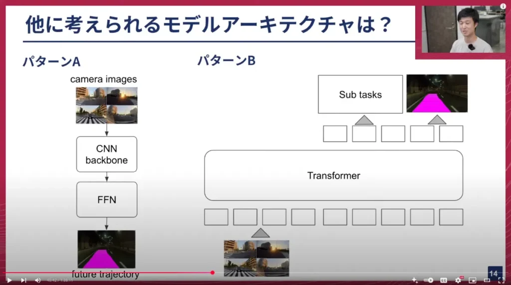 合田:それは単純に、サブタスクがなくても、かなり良いモデルが作れた事例があったからです。今まで、例えば路上駐車車両を避けるといった挙動は、3次元的に認識していないと無理だと思っていたのですが、パターンAでも意外とそれができたのです。そうすると「サブタスクいるのか?」となります。もちろんサブタスクも大事なのですが、サブタスクがあることによる良いことと、あまり良くないことという両面があると考えています。結局は「それ次第」という考えになりました。