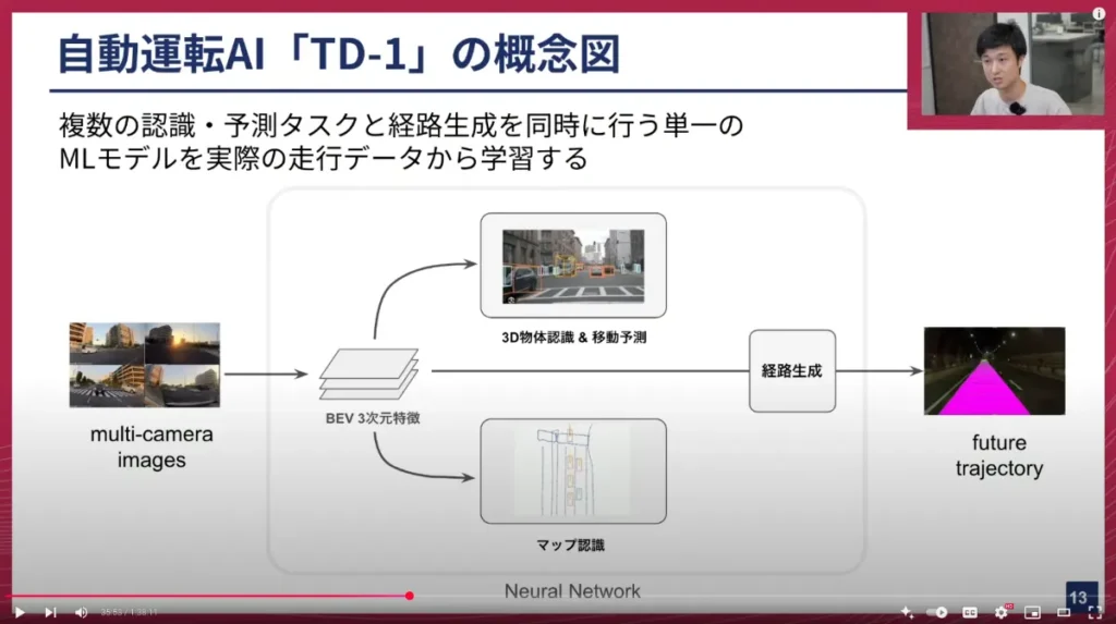 このBEVから、例えば3D物体検出や、その物体の移動予測、マップの認識(レーン認識など)を行い、さらに経路生成を行って経路を予測します。メインの経路計画タスクに、物体検出やマップ認識といったサブタスクを組み込むことで、モデルの3次元的な認識性能を高めつつ、鍛えられた認識や予測機能に基づいて自社車両がどう動くべきかの経路を予測する、というのが現状のTD-1のです。