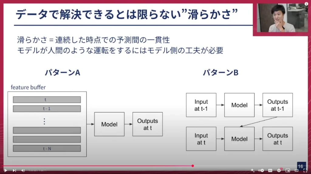 これは、先ほど説明したパターンAのようなモデルだと、各時点でカメラ画像を入力し、その時点での軌跡を出すという形になるため、各時点は独立と見なしたモデルの予測になります。そのため、一貫性がなくても仕方ない、という話になります。もちろん、モデルの入力に対する予測のロバストさを高めていけばガタつきは少なくなりますが、人間のような滑らかな運転をするためには、モデル側で工夫をする必要があります。