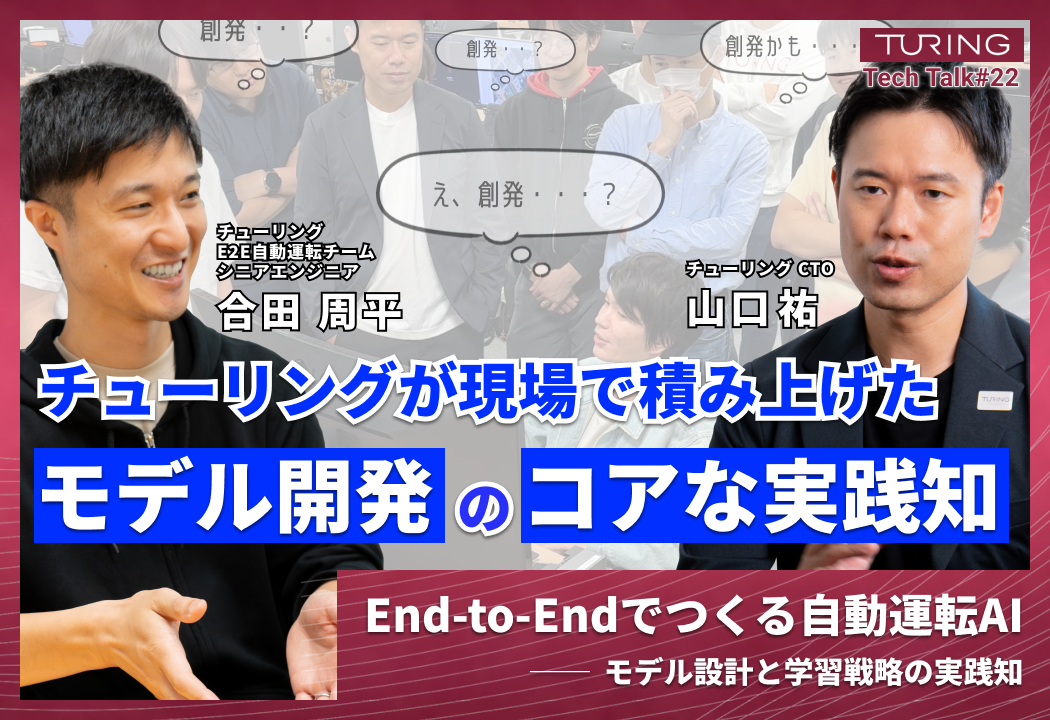 今回は、チューリングが目指す完全自動運転の実現に向け、E2E自動運転モデルの学習と開発において、現場で得られた実践的な知見や、データとモデル設計の重要性について深く掘り下げて解説。当社CTOである山口祐と、E2E自動運転チームのシニアエンジニアである合田周平が登壇し、開発の最前線を語りました。