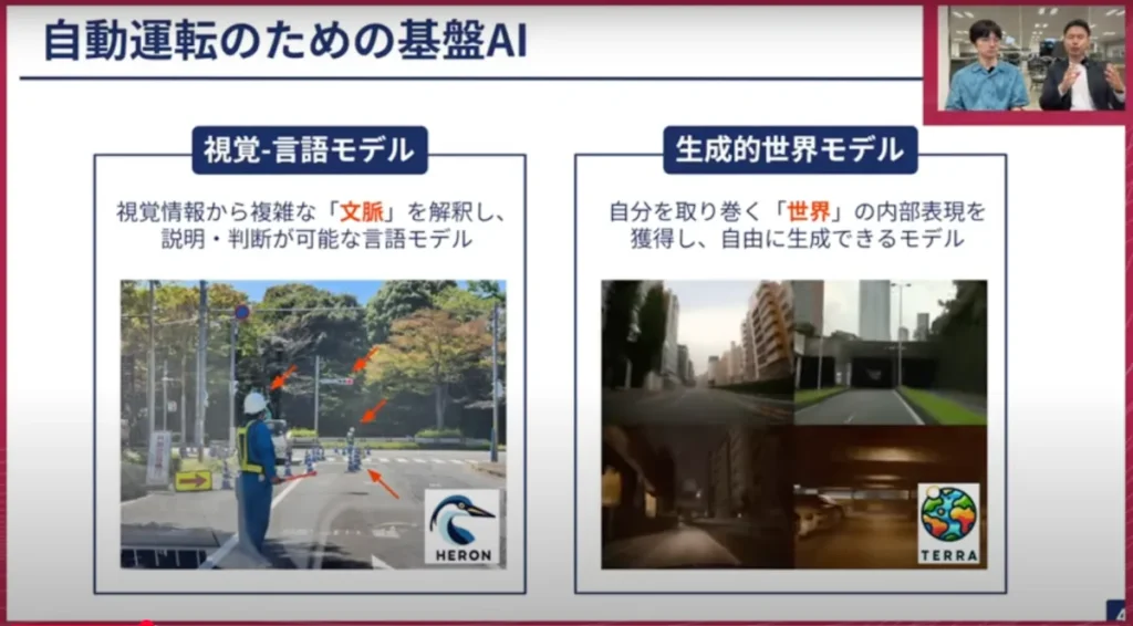 例えばOpenAIのSoraや、最近ではGoogleのVeo-3のように音声付きで動画を出力するようなものがありますが、それらにかなり近いようなもので、その自動運転版を開発しました。本日お話しするのは、この右側の生成的世界モデルに近い内容ですので、この後はじっくり荒居に話を伺っていこうと思います。よろしくお願いします。