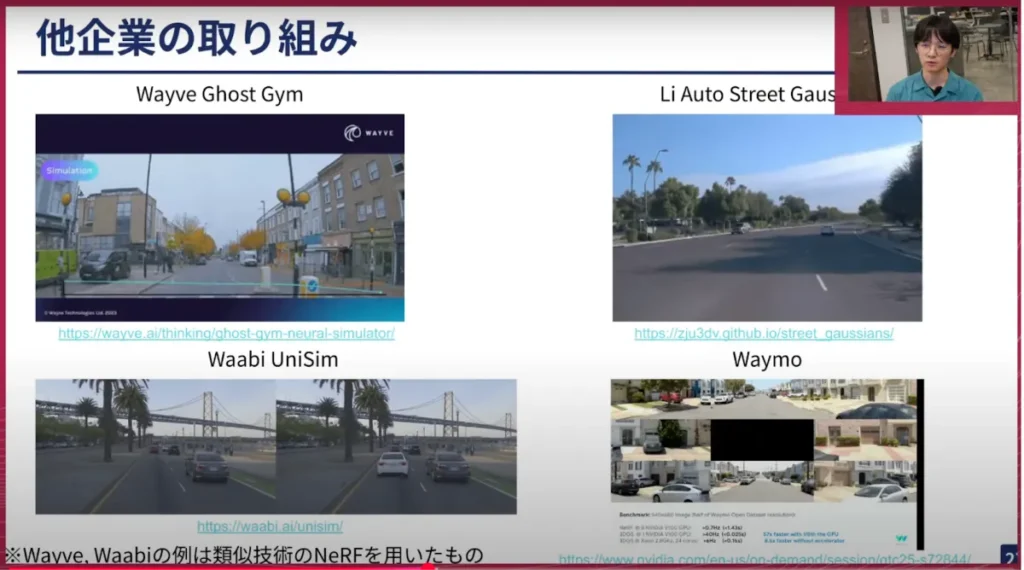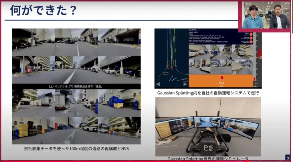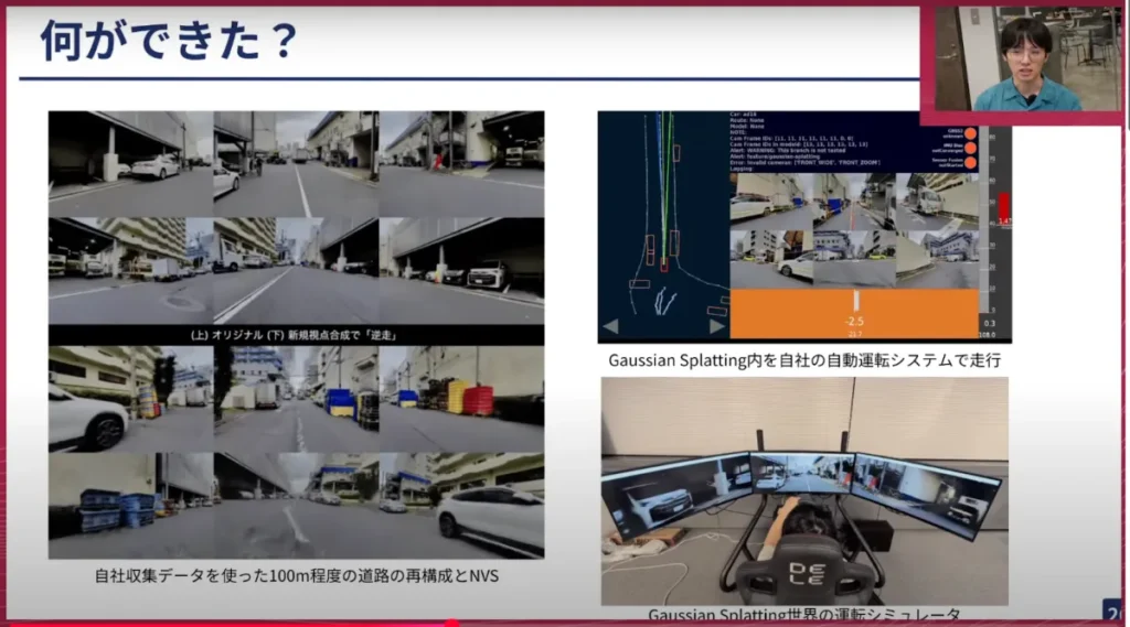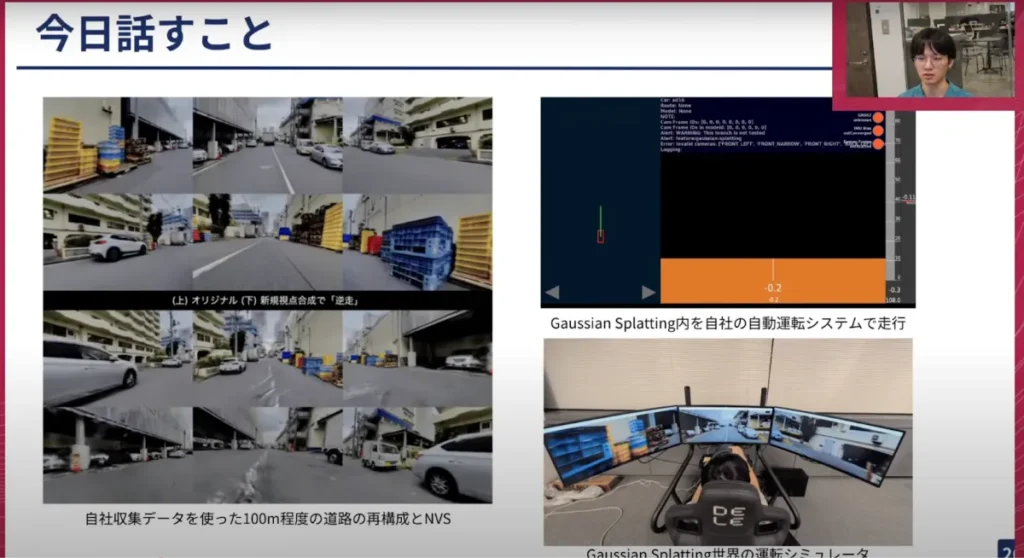 山口:実際にスライド右上のものなどは、我々が車の中で動かしているものと同じ描画をします。それはリアルのカメラの映像ではなく、Gaussian Splattingで合成した映像がここに送られてきて、それで車がモデル予測したり、走ったりできるということです。非常に面白い取り組みだと思います。これを本当に東京中の道でできたら、我々の自動運転開発も加速するのではないかと思います。