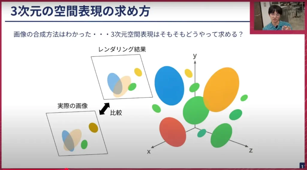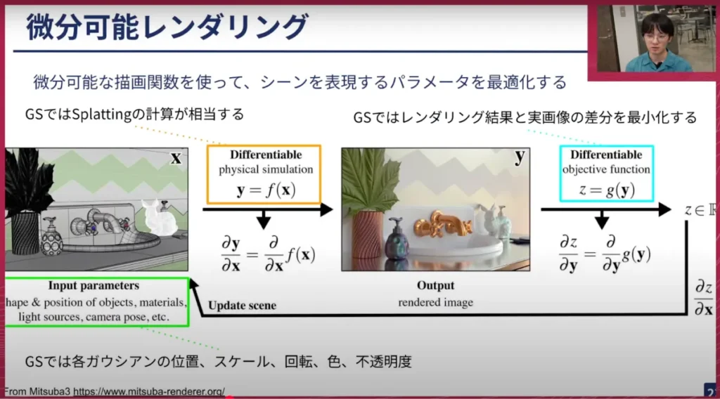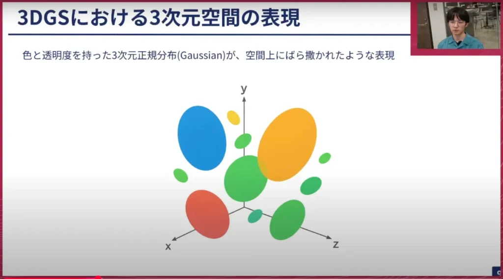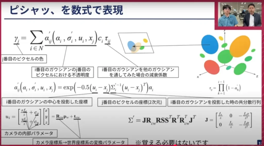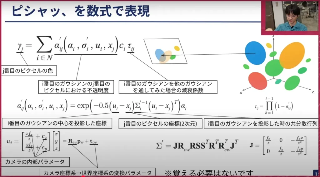 山口: ありがとうございます。別のスライドに移って、ここの数式表現はかなり難しいと思いますが、これはGaussianの数式表現で、教科書などに出てくるタイプのものです。カメラパラメーターやGaussianの透明度などを組み合わせて、基本的にはGaussianの一つひとつがこのような形で表現できる、ということですね。