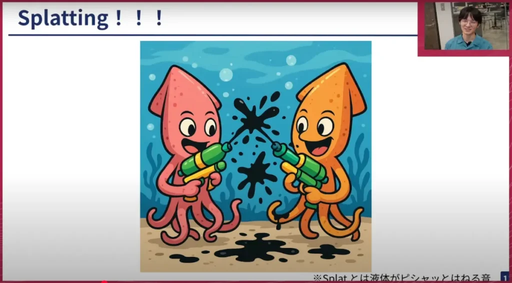 山口: 余談ですが、このイカが「ピシャッ」とするゲームがすごく好きです。「Splat」が「ピシャッとする」という意味だとは知らなくて、なんとなくスプラッター映画などから来ている「何かが飛び散る、液体が飛び散る」の表現なのかなと思っていました。