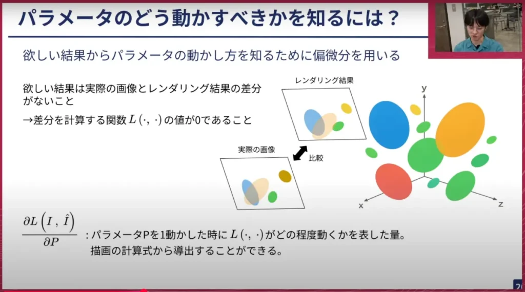 最終的に欲しい結果は、実際の画像とレンダリングの差分が全くないことです。したがって、この差を計算する関数を用意し、差分が0である状態を良いものとして、そうなるようにパラメーターを少しずつ動かしていきます。この損失関数、つまり差分を計算する関数に関して、パラメーターを少しずらしたらその関数に対してどれくらいの影響を及ぼすかを計算することが、偏微分を使うとできます。これを使うと目的とする状態、つまりレンダリングされた結果と実際の画像が同一である状態にするためには、どのようにパラメーターを操作すればいいかが分かります。