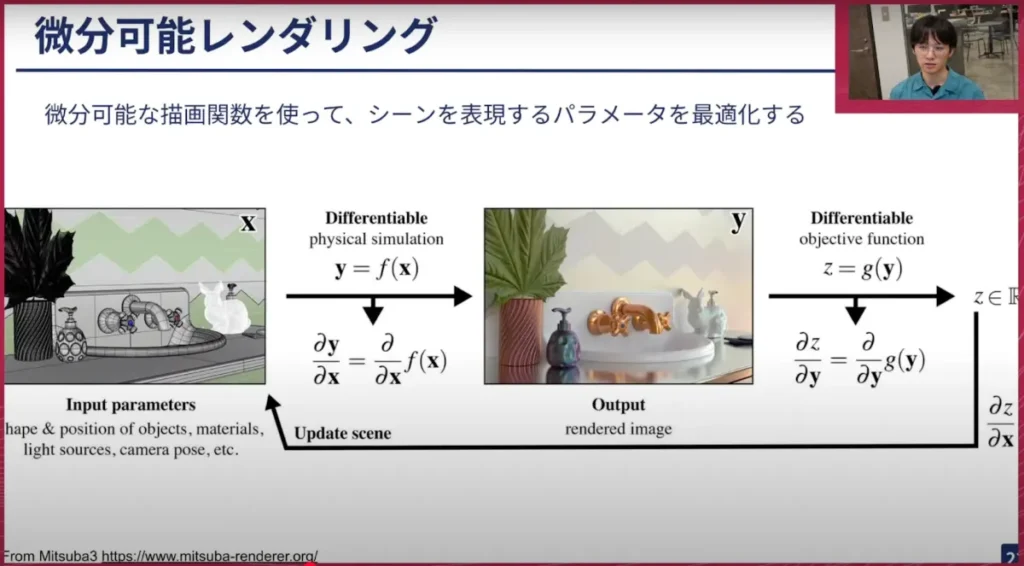 荒居: 実際に画像を作る作業をレンダリングと呼びますが、これをパラメーターで調節できるようにし、パラメーターで調節するとこのような画像が出てきます。それを何らかの損失関数に従って最適化できるようにする、このフレームワーク全体を、「微分可能レンダリング」と呼びます。