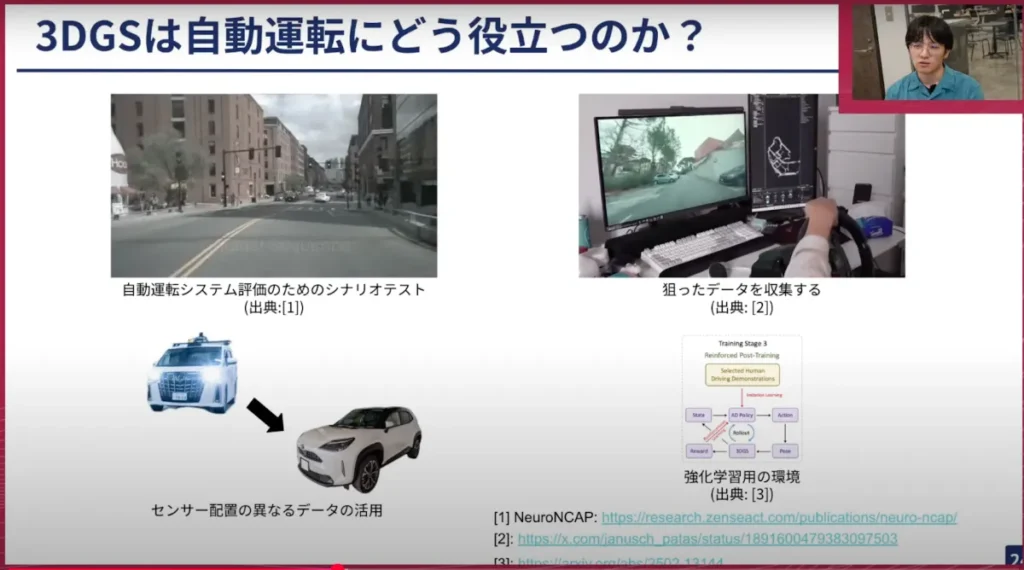 本日のテーマは、そのGaussian Splattingを自動運転でどう使っていくか、ということですが、話を整理するためにお話を伺っていこうと思います。