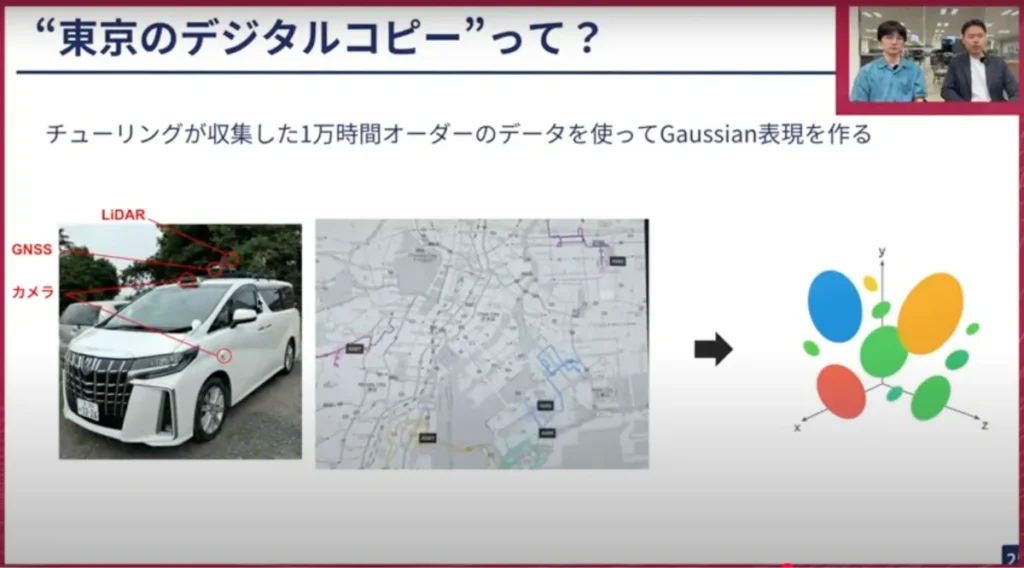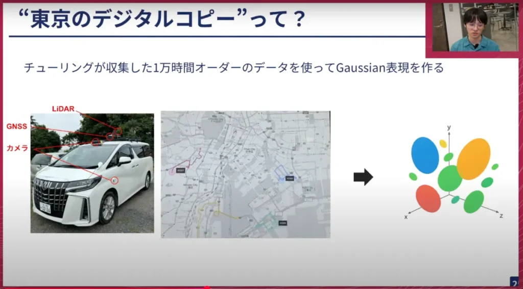 荒居: では、発表のタイトルにもある「東京のデジタルコピー」とは何でしょうか? これは、チューリングが今までに収集した1万時間オーダーのデータを使って、東京全体の3DGaussian表現をつくろうという野心的な試みです。