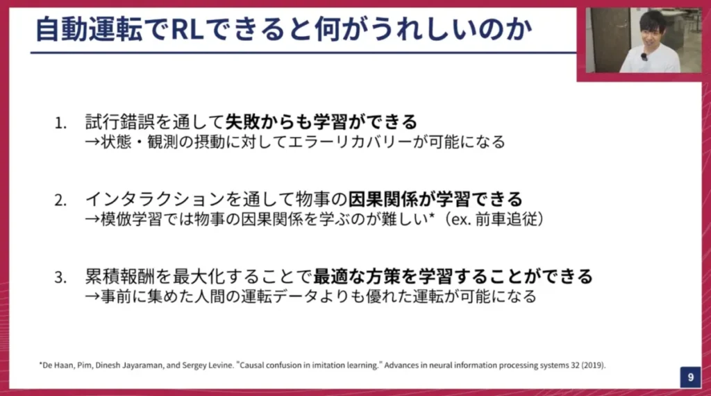 妹尾: では、自動運転において強化学習(RL)を導入することで何が嬉しいのか、そのメリットを大きく3点に絞ってご紹介します。