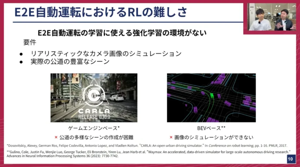 つまり、リアルなカメラ画像をシミュレーションでき、かつ豊富なシーンを持つシミュレーターが存在しないという点が、E2E自動運転における強化学習の大きな課題となっています。