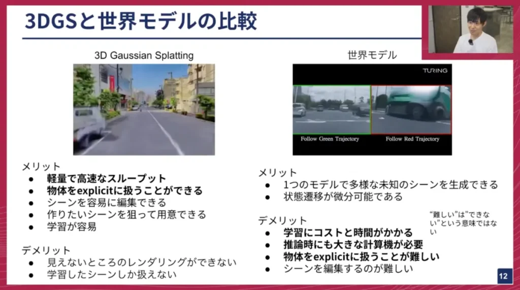 山口: チューリングでは3DGSと世界モデルの両方を開発しているので、どちらもよく質問されます。「これは世界モデルですか?」「ガウシアンスプラッティングですか?」といった質問を受けることも多いですね。両者のメリット・デメリットがここで整理されたのは、私自身も今後説明する際に非常に参考になります。