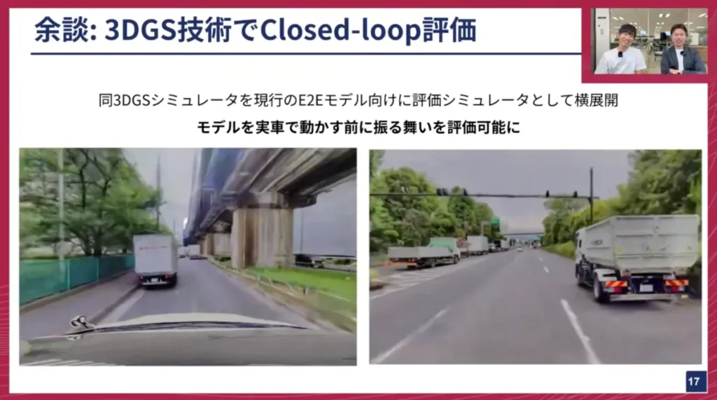 妹尾: 余談ですが、今回紹介した3DGSの技術は、模倣学習向けの評価シミュレーターとしても横展開しています。実写の自動運転モデルは、学習したモデルが実際に車に搭載されてどう動くのかを評価するのが難しいという課題があります。実車に載せないと評価が難しい場合が多いですが、この3DGSを使えば、実車にデプロイする前に、どのような動きをするかをある程度評価できるようになります。この技術は非常に応用範囲が広いと感じているので、個人的にも横展開を進めています。