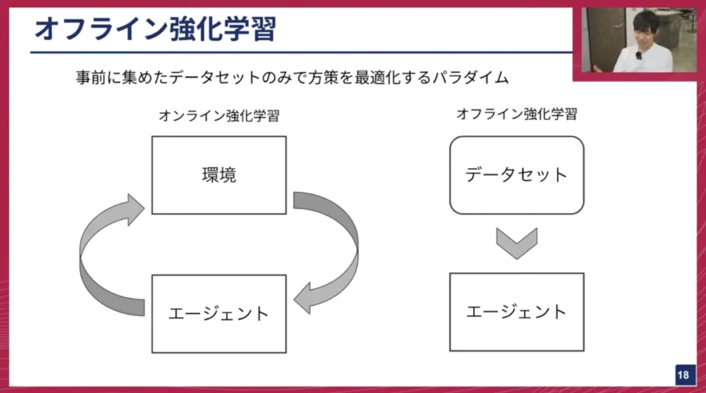 妹尾: 全く別の話になりますが、「オフライン強化学習」というパラダイムも存在します。強化学習と聞くと、エージェントが環境とインタラクションしながらオンラインで賢くなっていくイメージが強いと思いますが、オフライン強化学習は、事前に存在するデータセットのみを使って最適な方策を学習するパラダイムです。
