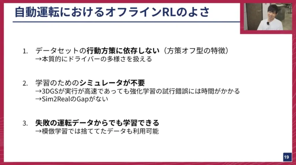 しかし、最大の難しさとして、自動運転のデータセットには「失敗のデータ」がほとんどないという課題があります。例えば、信号無視をしたデータがあれば、それを負の報酬として扱って学習することができますが、現実世界のドライバーは基本的に信号無視をしないため、そのようなデータが存在しないのです。現状、このオフライン強化学習を直接適用することは難しいため、いかに失敗データを作り出すかというアイデアを考えています。これは将来的に取り組みたいテーマです。