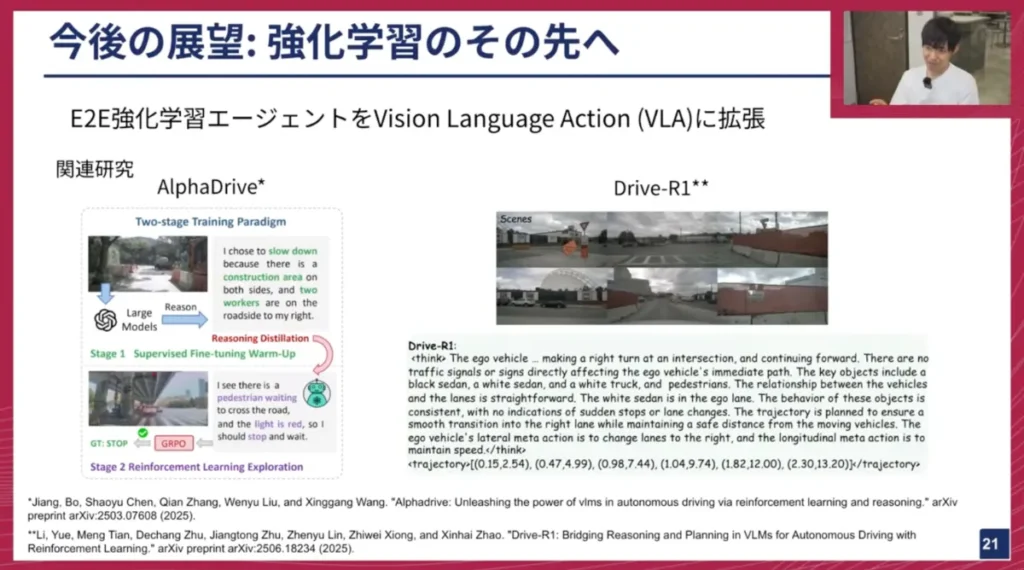 自動運転におけるVLAモデルに関する研究事例は既に存在します。例えば、中国の大学の論文である「AlphaDrive」は、自動運転版の「DeepSeek」のようなものです。データセットには「Stop」や「Go」、「Left」「Right」といった運転指示のラベルが付与されており、VLAモデルがそれらを推論し、「今ストップすべきだ、ストップ」といったように言語で説明します。その推論が正しければプラスの報酬、間違っていればマイナスの報酬を与え、強化学習で学習していきます。