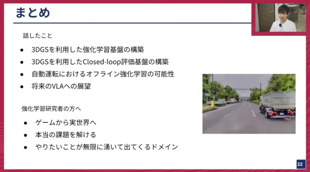 山口: 最後のVLAモデルの話にもありましたが、LLMやマルチモーダルモデルの領域でも強化学習が使われており、それが自動運転に応用されたり、あるいはその逆も起こり得ると考えています。自動運転で非常に難しいタスクを解く手法が、強化学習や世界モデルといった新しい技術を取り込みながら進化し、それが他のドメインにも波及していくことは大いにあり得ますね。これは、機械学習やAIの研究・開発において、まさに最先端の部分だと個人的にも感じています。