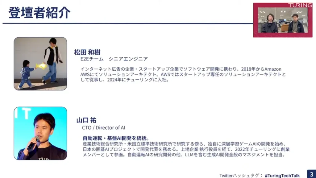 改めまして、私はチューリングCTO兼Director of AIの山口です。チューリングのソフトウェア開発、AI開発を統括しています。