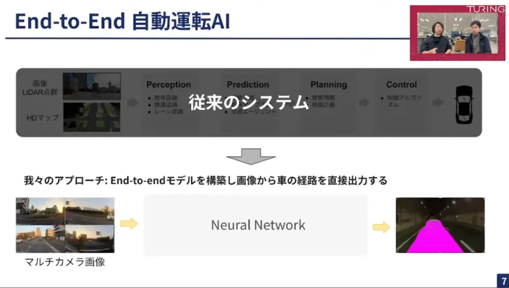 ですが、チューリングはEnd to Endなので、すごく簡素化した図が今出てるかと思いますが、8個のカメラを設置して、そのカメラの入力を元にモデルが何かしらの推論を行って、「道路の状況がこのような感じだからこういう風に走ったらいいのではないんですか」と車の経路を出す。ある意味、モデルの中身がブラックボックスのようになっているモデルを、End to End自動運転モデルとして今開発しているところです。