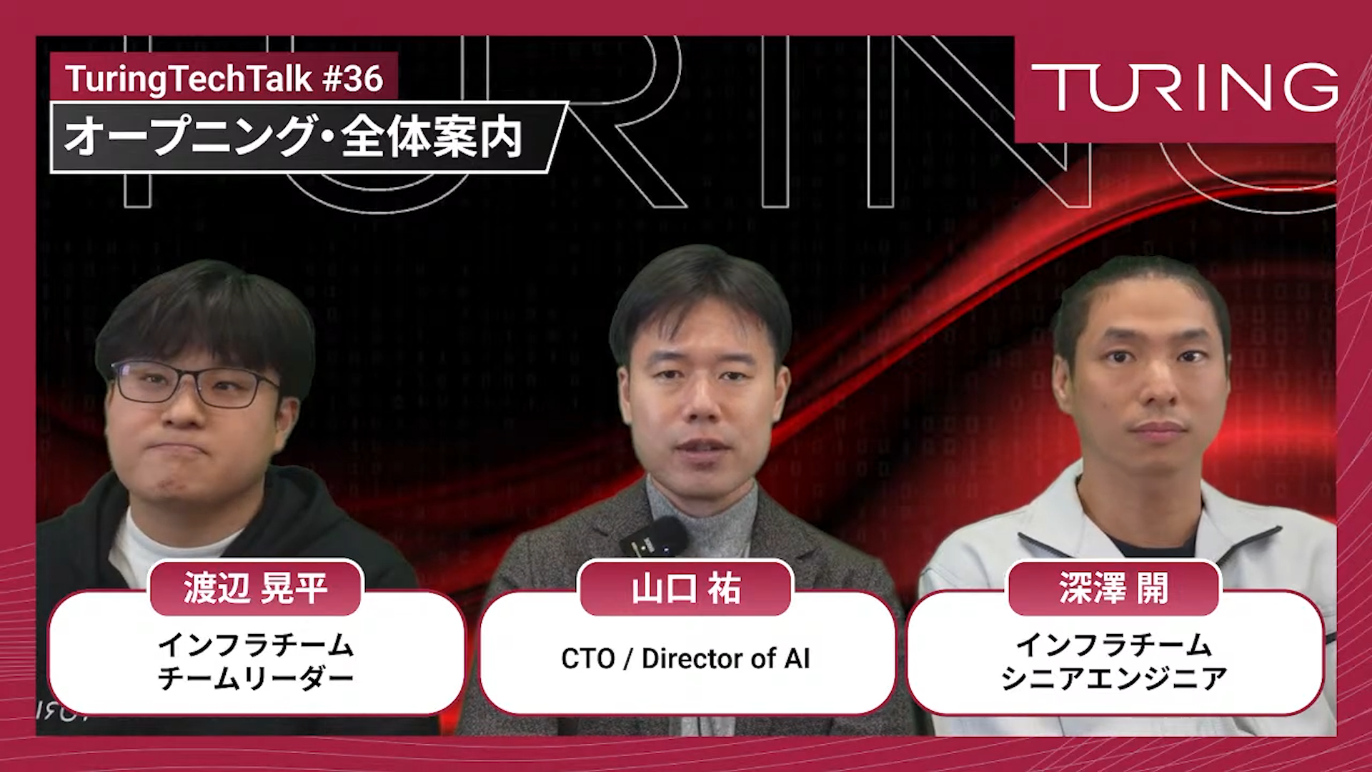 山口:皆さんこんにちは。CTOの山口です。今回は「チューリングのインフラチームが描くーフィジカルAIのGPUクラスタ構想」と題しまして、チューリングが現在使っている、あるいは今後作ろうとしているGPU基盤を、どのようにしていくのかという点について、インフラチームの2人、渡辺さん、深澤さんに伺っていこうと思います。渡辺さん、深澤さん、本日はよろしくお願いします。