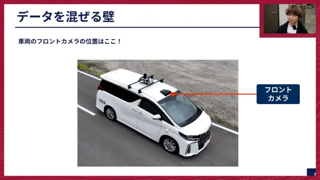 阿部:我々がデータ収集や走行試験に使っている車両、アルファードのフロントカメラは、フロントガラスの上にある黒い部分に付いています。他のカメラもたくさんついていますが、このフロントカメラの位置であるとか、センサーごとの差がどうしても出てきます。同じ設計で車両を作っていても違いが出ます。