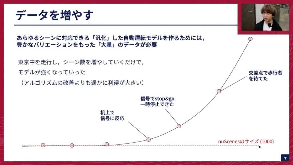 阿部: まず、データを増やすという話をしました。このグラフは、我々が学習に使っている自動運転のデータセットのスケールを表しています。赤い点線で示されているのが、自動運転界隈で非常に有名なデータセットであるnuScenesです。これが1000シーンあります。1シーン約20秒間の動画になっています。これに対して、我々が持っているデータセットは、これを大きく超えてまして、シーン数を増やすごとに、既知の信号に反応できるようになったり、一時停止でストップ&ゴーができるようになったり、交差点で歩行者を待てるようになったりといったことができています。