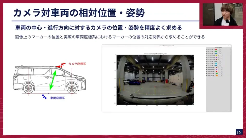 阿部: 右にあるのは、これを求めるためのGUIツールです。自分の車を止めた時に、フロントカメラから見える光景に、地面に引いてある線の交点の3次元座標と、画像上の座標の対応関係を決めてあげると、OpenCVのsolvePnPという関数を使って、カメラの座標が車両座標に対してどういう変換になっているか、というのが分かるようになっています。