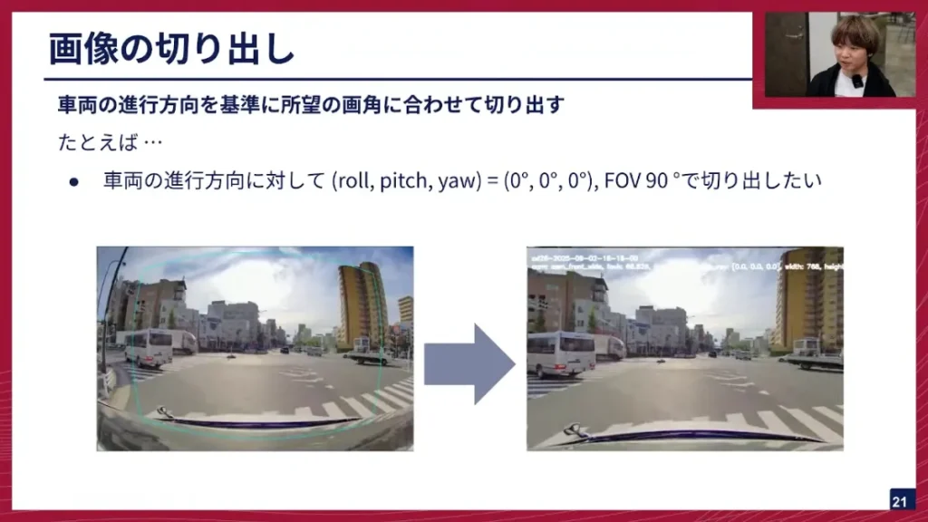 阿部: 最後に、3つ目の画像の切り出しです。車両の進行方向に対して、所望の画角に合わせて切り出してあげるということを行います。例えば、車両の進行方向ベクトルに対して、roll、pitch、yawが0°で、画像のFOV(画角)90°で切り出したい、というような指定をしてあげると、下の画像のように、切り出し前の歪んでいる画像から、水色の枠の範囲を切り出す、ということを行っています。