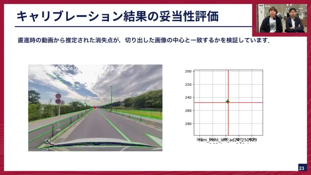 阿部: これは、直進走行する場所で、消失点の位置が切り出した画像の中心と一致しているかを確認するための検証です。ハフ変換などを使って画像中の直線を検出し、そこから消失点を推定します。この赤い丸が推定された消失点、白い十字が画像中心ですが、今ほとんど重なっています。これは良い状態です。キャリブレーションがうまくいかないと、かなりずれた場所に出てきます。