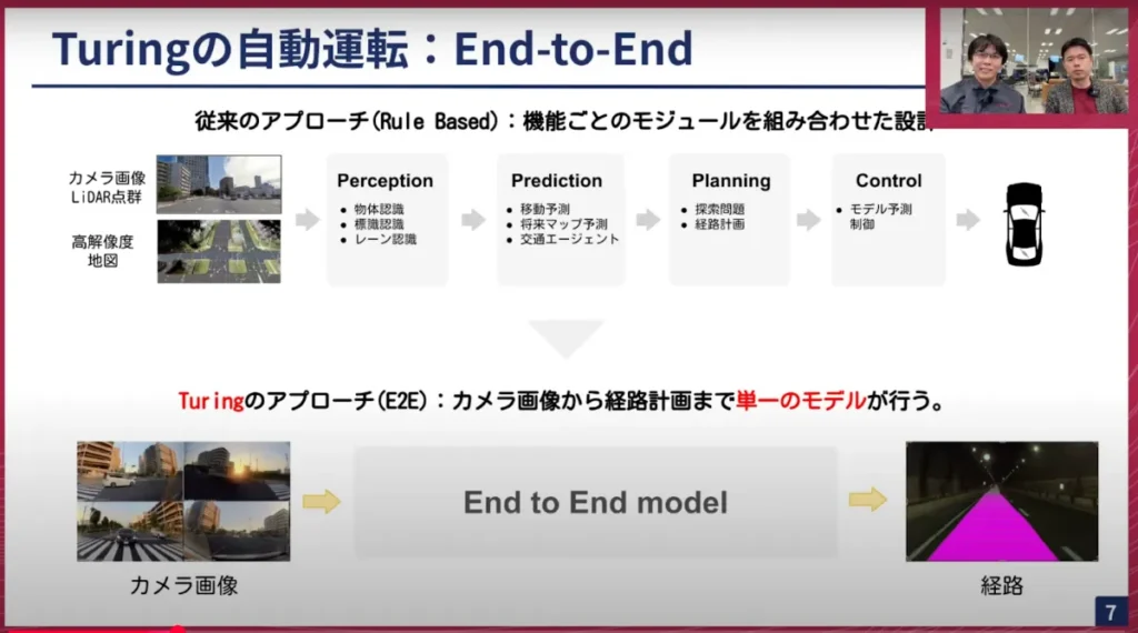 チューリングで作っている自動運転のモデルというのは、End-to-endというモデルになっております。(スライドp7)こちらのスライドにあります通り、従来のアプローチと書かれているのがRule Basedと言われる機能ごとのモジュールを組み合わせたAIの作り方なのですが、これを一気通貫でやるEnd-to-endモデルというのが、我々チューリングのアプローチになっています。具体的に言うと、左側のカメラ画像を入力として、最終的に車が進むべき経路を1つのモデルで推論しようというものになっています。