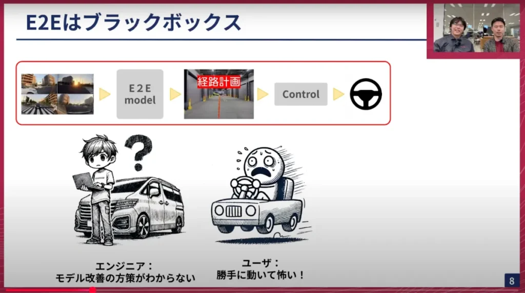 山口:そのEnd-to-endですが、最近の生成AIやモデルがどんどん大きくなっている中で、まるでブラックボックスのようになってしまって、その意図がなかなか外から分からない部分があります。そこは自動運転において凄く安全性の面で重要になってくるので、そこをしっかりと見たいという感じです。