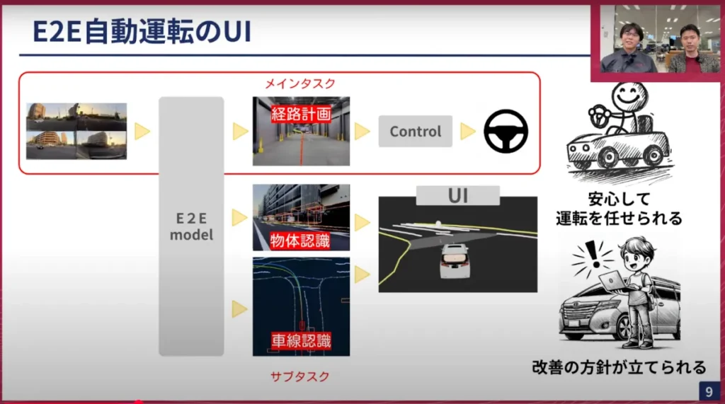 僕も最近、自分の車を自動運転改造して乗っていますが、突然動くと怖いわけですよ。さっきまで止まっていたのに突然動き出したら「おお何やってんだこいつ」となるんです。そういうのは体験として良くないよね、と日々思っています。そのため我々のアプローチは、このEnd-to-endのメインタスクと呼ばれる経路計画以外にも、サブタスクを出力させて、それを使ってUIを出力させています。