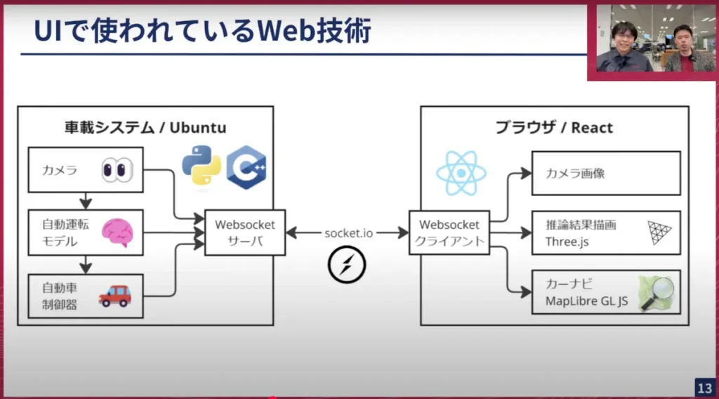 山口:ありがとうございます。少し教えて欲しいのですが、基本的にはWebsocketのサーバーが車載システムで動いてるという話がありましたけど、これは車の中に車載のメインの計算機があって、ここの中でOSとしてはUbuntuベースのものが動いてる。その車載計算機の中にWebサーバーが立っていて、そこを起点としてブラウザ側で何かが見られるようになっているというイメージで合っていますか?
