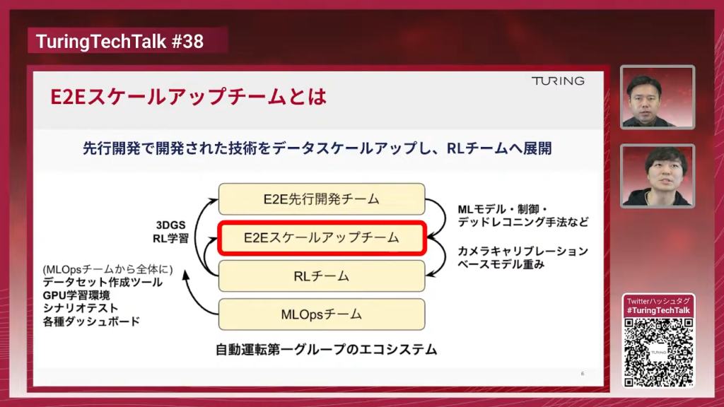 塩塚:「Tokyo 30」は1つのチームだけで作ったプロジェクトではなくて、会社全体で取り組んだプロジェクトになるんですけれども、その中で自分のチームと関わりが深いところが今4チームあります。まず一番上に「E2E先行開発チーム」がありまして、ベースのモデルや制御のところを作ってくれて、シンプルな条件でモデルや制御の開発をしていきます。「E2Eスケールアップチーム」はその技術を受け取って、データをスケールさせる(規模を拡大する)ところをメインに取り組んでいます。