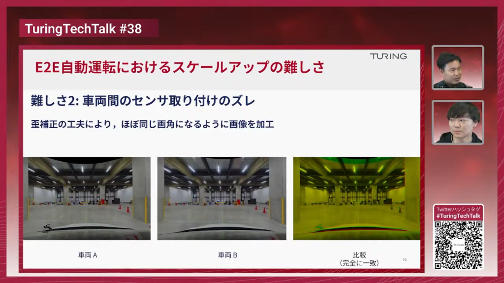 でも我々はLiDARを車から外したので、カメラで頑張るしかない。カメラのズレ、レンズ歪み、収差などが影響して、モデルから見ると「こっちの車とこっちの車で違う、どっちが正しいんだ」となりますよね。最初に話題に出したまっすぐ走らない問題にも、センサー誤差が大きく影響していました。これ、どう解決したんですか?