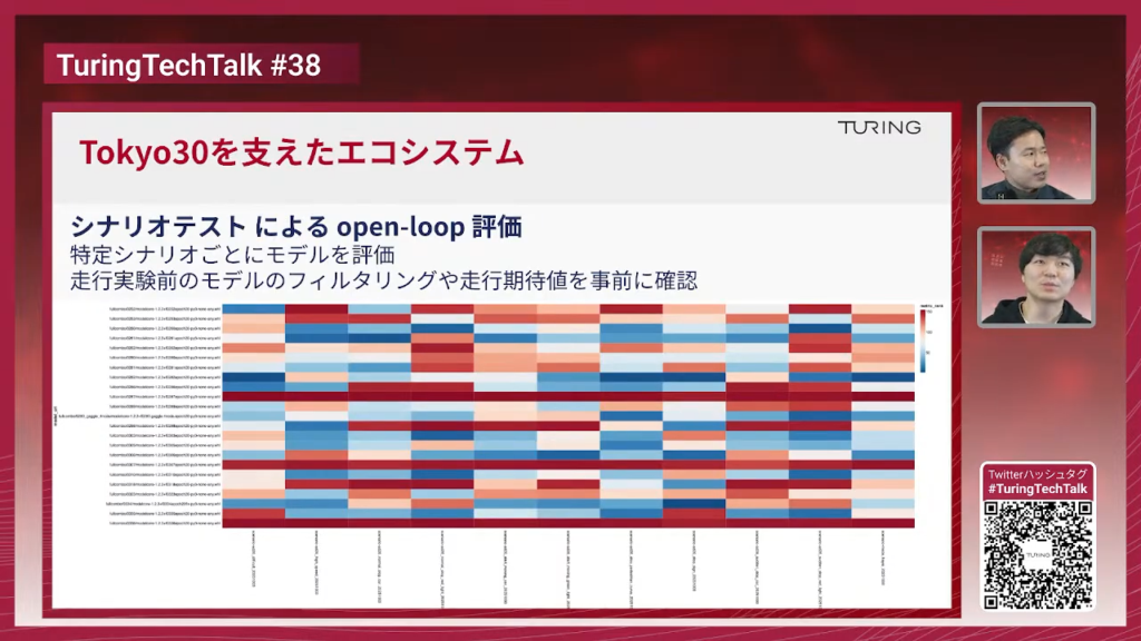 塩塚:シナリオテストは、赤信号停止、右左折、横断歩行者待ち、Rが厳しいカーブなど、事前に用意したシナリオごとにモデルを推論させて評価します。赤〜青のグラデーションで、濃い青が良い性能です。新しいモデルを作ったらまずシナリオテストにかけ、真っ赤なら実験に持って行くのは危ないとなります。逆に真っ青なのに実験でおかしければ、モデル以外にバグがある可能性も分かります。実験に持って行ってはいけないモデルのフィルタと、走行期待値の事前把握という2つの目的で使っています。