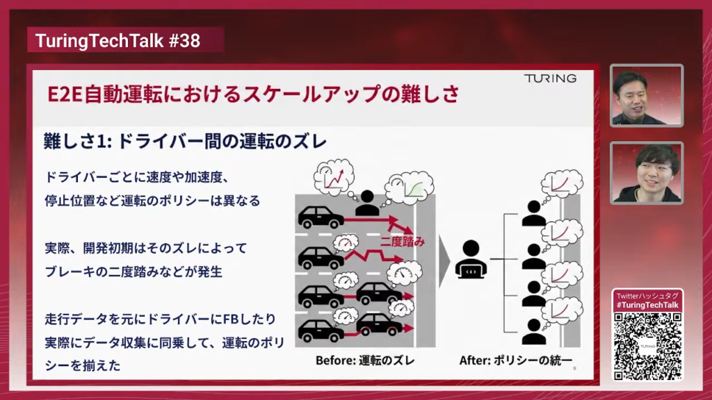塩塚:分かりやすいところで言うと2つ難しいところがありまして。1つは、ドライバーがそもそも複数いるので「運転ポリシーが違う」というのがありまして。運転って人によって全然違うものですよね。E2E自動運転なので人の運転をそのまま学習させるんですけど、あるドライバーはこの道でこういう運転をした、あるドライバーが同じ道を走った時に違うような運転をしたみたいなところがあると、モデルって迷っちゃうんですね。