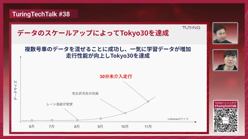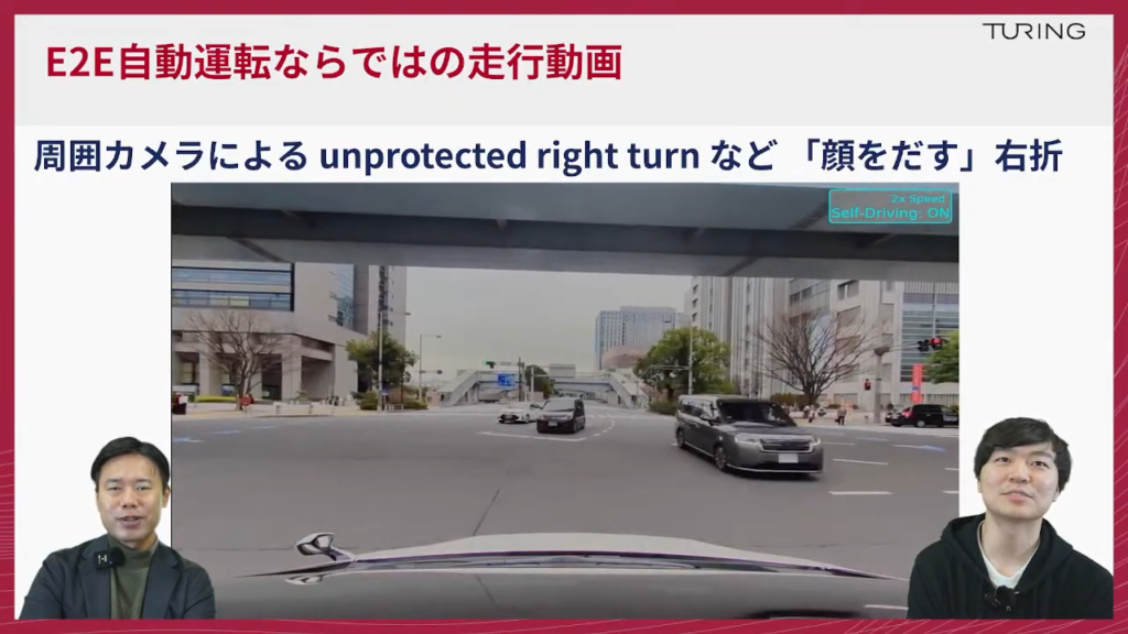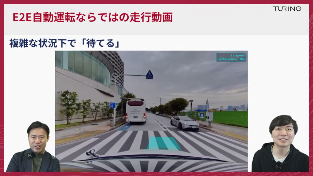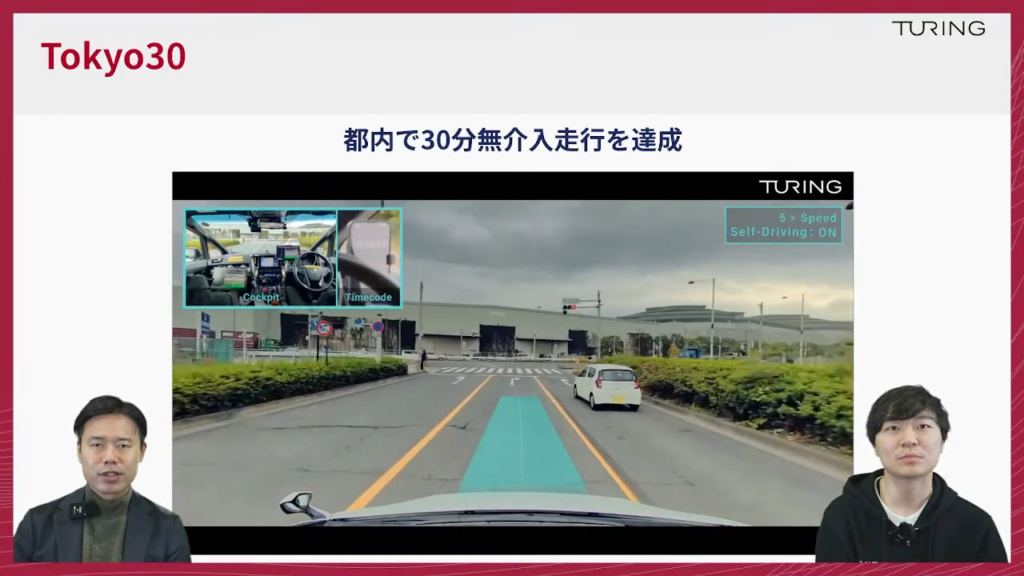 山口:チューリングが2024年から「Tokyo 30」という東京都内を30分間無介入で運転するE2Eモデルを作りましょうというところを目指していたわけですけれども、この達成時の映像が昨年(2025年)の11月末ですので、まだ数ヶ月しか経っておりませんけども、そこから我々もさらに進化しているということですね。