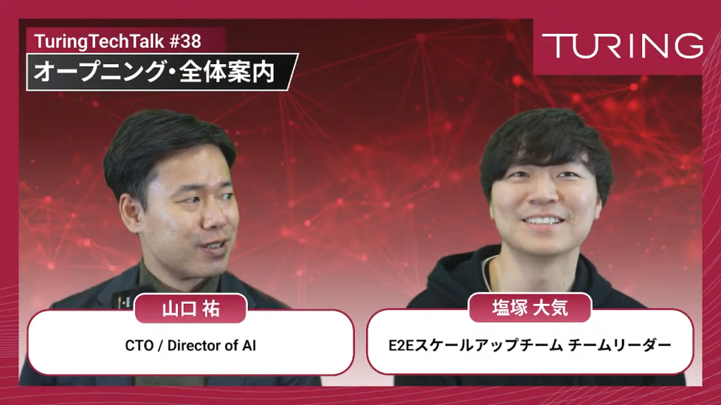 山口:皆さん、こんにちは。TuringTechTalk第38回「E2E自動運転をスケールさせる ─ Tokyo30を支えたデータと学習のエコシステム」を開始したいと思います。今日はE2Eスケールアップチームのチームリーダーの塩塚さんをお招きしております。塩塚さん、よろしくお願いします。