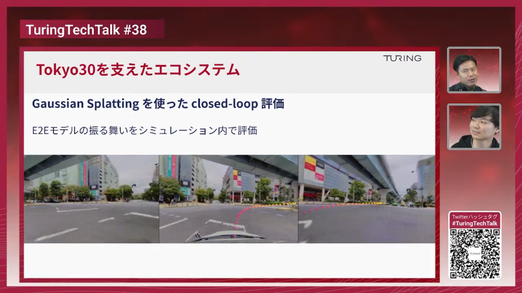 山口:3D Gaussian Splattingの技術はチューリングが世界的にもかなり頑張っているのではと思いますね。走行データから全シーンに再構成をかけるようMLOps的にはなっていますね。社内では数万シーン規模のクローズループ環境があり、評価や強化学習ができるエコシステムが整っていて、「Tokyo 30」達成モデルも鍛えられてきたわけですね。詳細は前回のTech Talkで紹介していますので、こちらもぜひご覧ください。