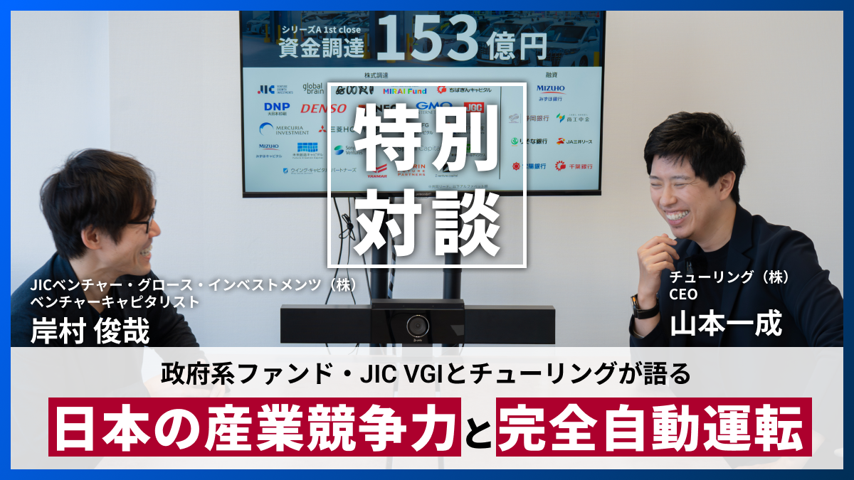 このたび、チューリングはシリーズA 1st closeにおいて153億円の資金調達を実施しました。本記事では、共同リード投資家として出資を決めたJICベンチャー・グロース・インベストメンツ株式会社(JIC VGI)の岸村俊哉氏と、チューリングCEOの山本一成が対談。