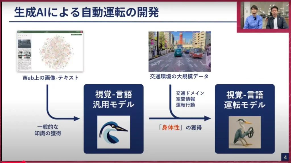 こういったデータを使って視覚言語汎用モデルに学習させると、視覚言語も分かり、運転もできる、非常に人間に近い自動運転ができるのではないかと考えています。今回はそのベースとなる汎用モデルなので、その辺をお話できたらと考えております。