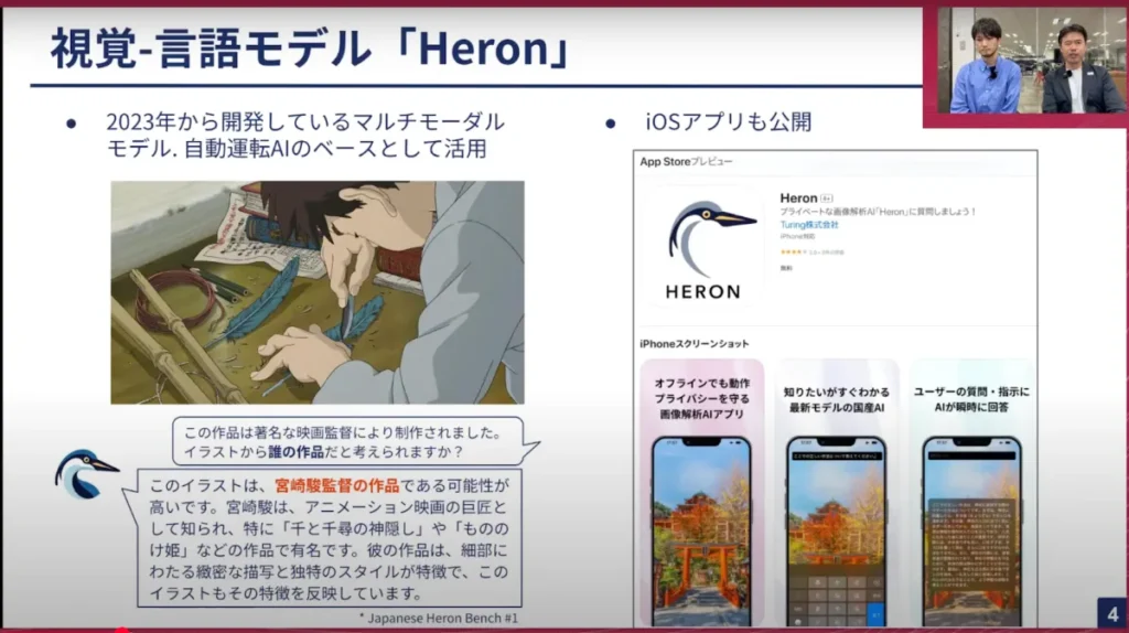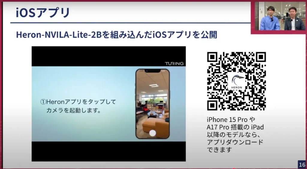 山口:これはApp Storeで公開しています。お手持ちのiPhoneでこのQRコード、もしくはApp Storeで「Hero」と検索してもらえると出てきますので、動く国産VLMということで結構反響をいただいています。我々は色々な研究成果を発信してテックブログなども書いているのですが、車に乗っているわけでもないですし、色々な人に体験してもらうのがこれまで非常に難しい状態でした。今回このようにアプリとして出して、横井が作ったHeron-NVILA-Lite-2Bが実際にスマートフォンに載って動いているというのは、我々としても意外なフィードバックもあって非常に良かったかなと思います。