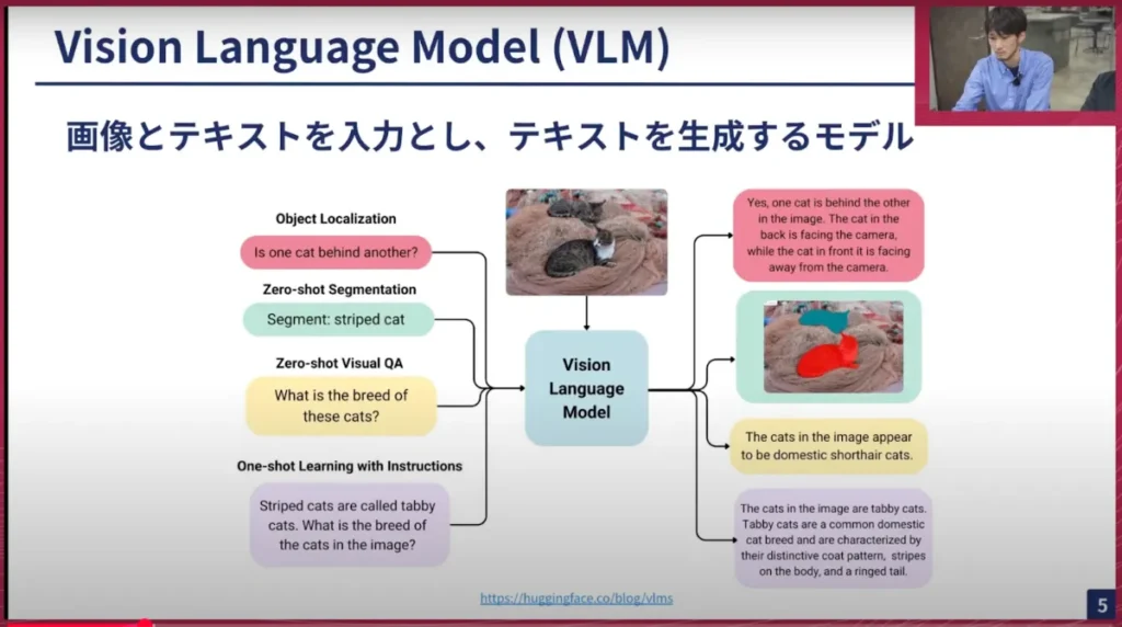 横井:最初に、いきなりVLMと言われても分からない方もいらっしゃると思うので、VLMとは一体何なのか? これから少し話していこうと思います。このスライドに書いてある絵のような感じです。画像とテキストを入れてテキストを出すモデルを、ここではVLMと呼んでいます。セグメンテーションもしていますが、これは見なかったことにしていただいて、テキストを出力するものをVLMとここでは扱います。