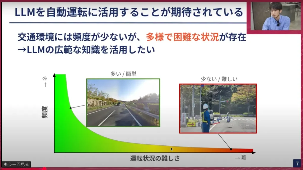 そのため、このような状況をモデルに学習させようとしてもデータが少ないため、難易度も高いという課題があります。そこでこうした難しいケースを、LLMの持つ常識的な判断や広範な知識を活用して、自動運転でうまく解決していこうという意図があります。