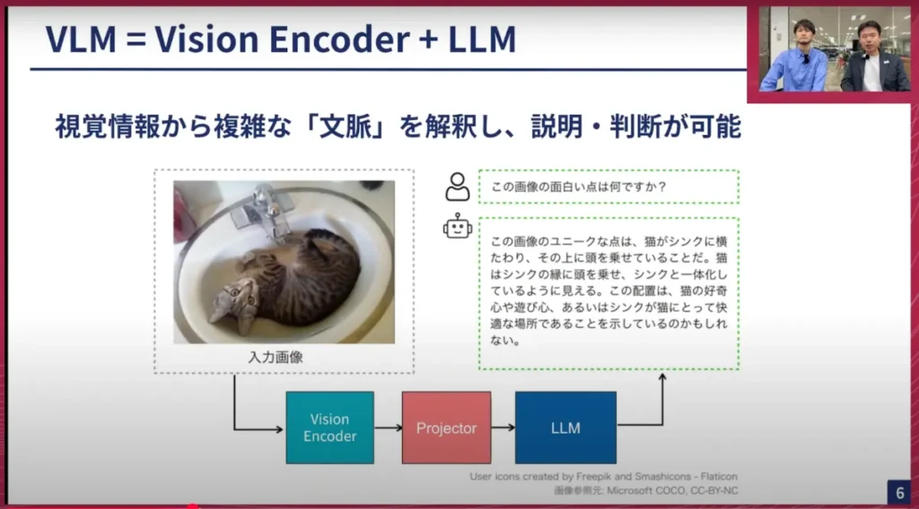 山口:少し戻って、VLMの仕組みについてもう一度お話したいと思います。この図は、おそらくこの分野を研究している人ならすぐに理解できると思いますが、LLMとVLMの関係はかなり難しいと思います。このLLMは、おそらく一般的なLLM、つまり元々LLM単体として存在していて、それをそのまま持ってくるという形であっていますか?